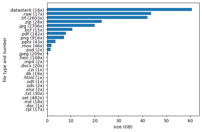 To get a first idea about the types of data files we are up against, let’s see how many files we have for each type, and what their size is.