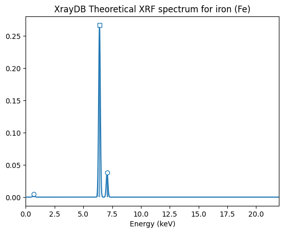 ax.set_title(f'XrayDB Theoretical XRF spectrum for iron (Fe)')