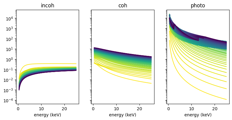 S = np.array(mu_coh_list) + np.array(mu_incoh_list) # ignore Compton shiftcmap = plt.get_cmap('viridis_r')
